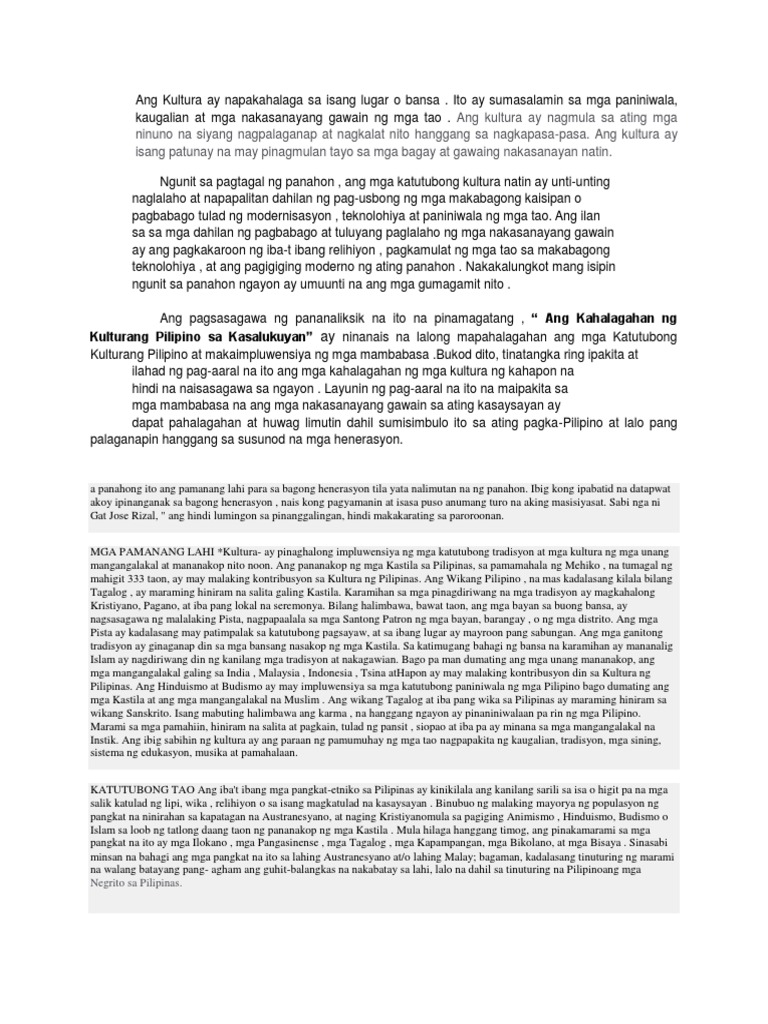 Dumako naman tayo sa aspeto ng pananampalataya kaugalian paniniwala at kasabihanNoon ang pananamit ng mga kababaihan ay konserbatibo. Para sa aking opinyon hindi batayan ang paggamit ng ingles ang pagiging matalino ang pagiging matalino ay kung paano mo pahalagahan ang kultura mo. 21102020 Essay tungkol sa katutubong kultura ng mga pilipino - 5292584 Answer.