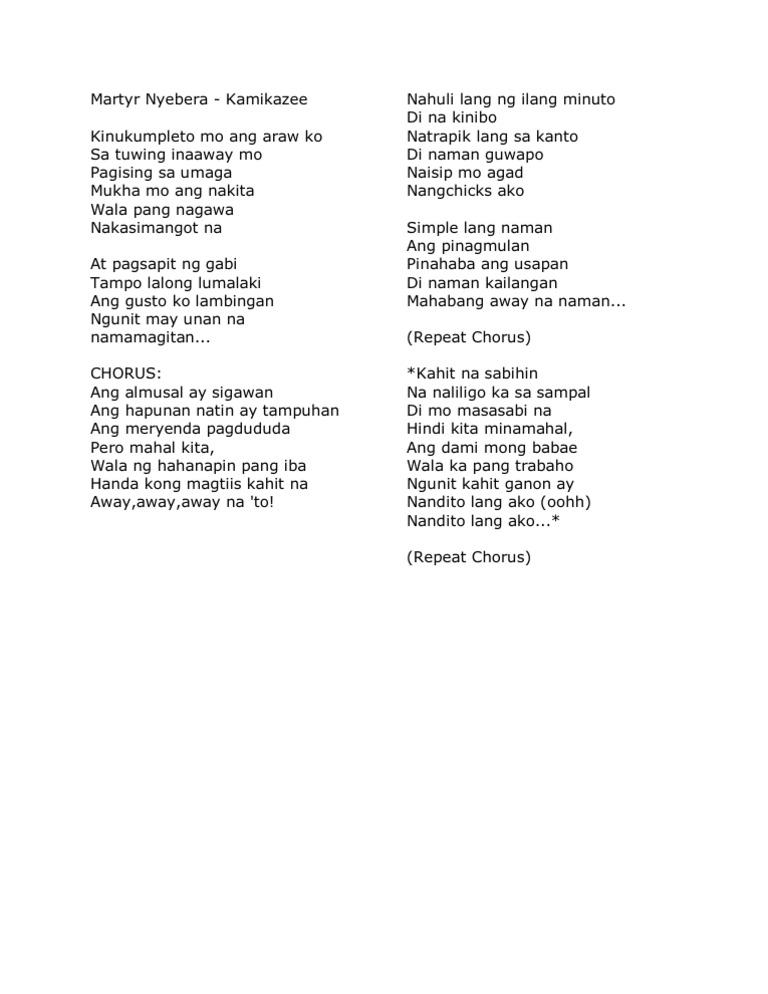 Kahit na sabihin na naliligo ka sa sampal Di mo masasabi na hindi kita minamahal Ang dami mong babae Wala ka pang trabaho Ngunit kahit ganun ay nandito lang ako Nandito lang ako. Kamikazee Martyr Nyebera lyrics - Lyrics to Martyr Nyebera song by Kamikazee Martyr Nyebera lyrics as txt pdf docx. Kayat nagtitiyaga sa tuyo at tinapa.