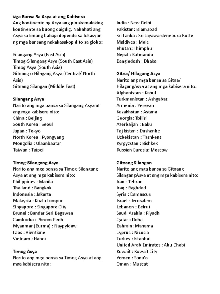 Tinatawag rin ang hilagang parte na ito na Soviet Asia. Ano ang mga bansa sa kanlurang asya at mga kabisera nito. Mga artikulo sa kategorya na Mga bansa sa Asya.